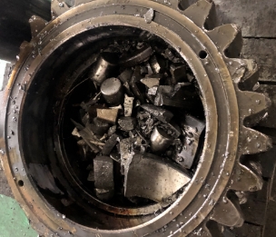 拆解后观察,箱体内部存在大量铁削与零件碎片,所有齿面均已研磨损伤,三级行星总成打齿严重,已严重卡死,三级行星轮所有轴承全部粉碎性损坏。