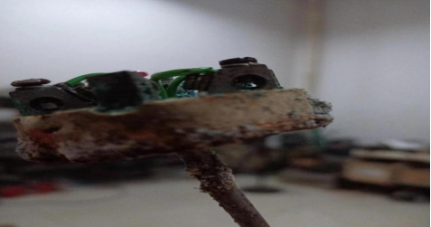 3.将热电阻从保护管里拉出,观察热电阻表面不怎么清洁,测温元件有锈蚀、无损坏,铠甲顶端无磨损现象。