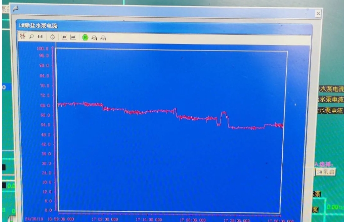 正常情况,除盐水泵60多安的电流流量能达到40多吨,现在电流降低到56.1A后,流量显示126.3吨。