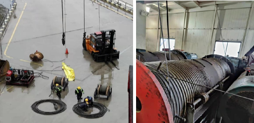第五步:将旧钢丝绳连着牵引绳一直放到地面上,拆除旧绳,将牵引绳与新钢丝绳对接,利用电机滚筒将新绳往上拉,直至牵引绳全部从滚筒上脱出。