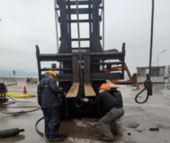 第一步:门机停至检修指定位置,将4根钢丝绳从吊钩或者抓斗上脱开,变幅伸至最大,检修区域用安全围栏进行隔离。