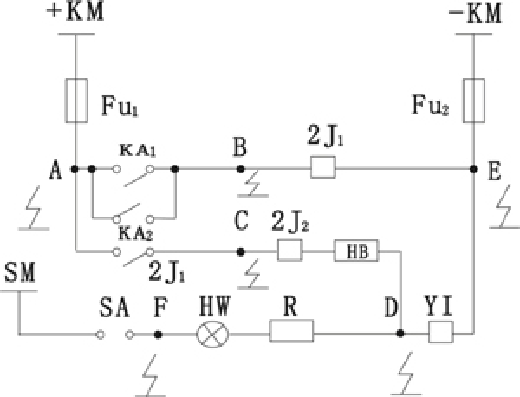 由于断路器跳闸线圈均接负极电源,当发生系统正极接地时,正极经过大地,构成回路。如图所示,当图中的A点和B点同时接地,相当于A、B两点通过大地相连接起来,中间继电器2J1动作造成断路器的跳闸。同理,当图中的A点和C点同时接地,和图中的A点、D点同时接地均可能造成断路器的跳闸